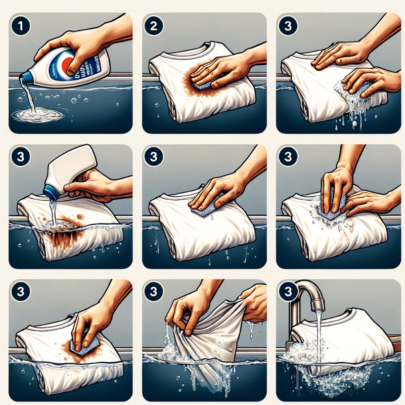 | 미지근한 물 사용: 세제를 바른 후, 미지근한 물에 티셔츠를 담가 10-15분간 담가둡니다. |
