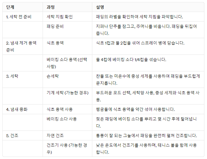 | 식초 용액 사용: 세탁 후, 패딩을 헹굴 때 식초 용액을 물에 약간 섞어 사용합니다. 이는 냄새를 중화시키는 데 도움을 줍니다. |