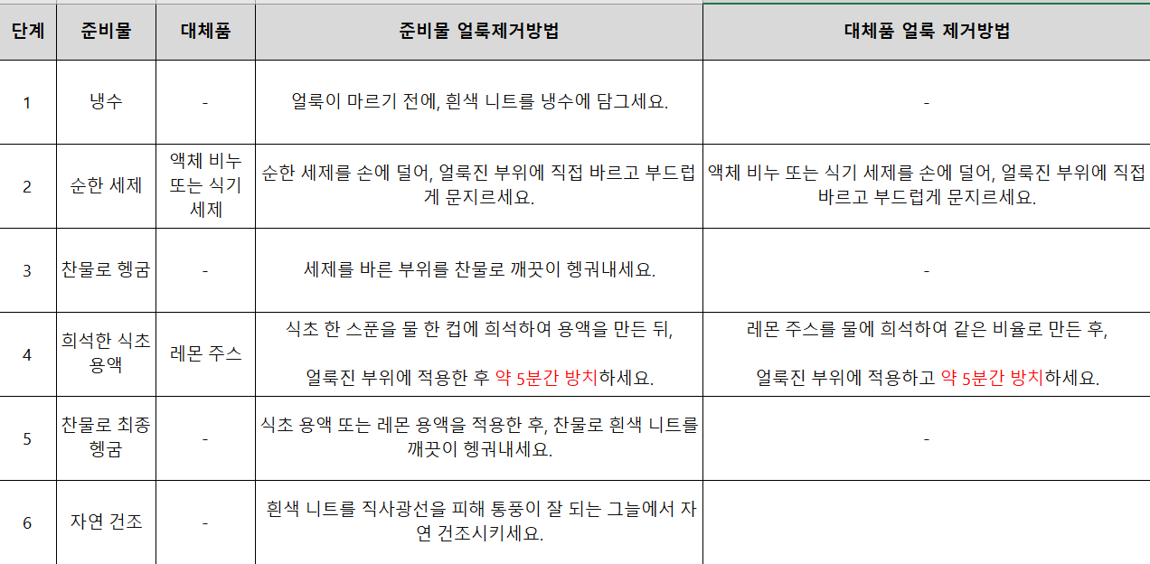※ 흰색 니트 음식 얼룩 제거 방법을 표로 확인 하실려면 클릭하시길 바랍니다.